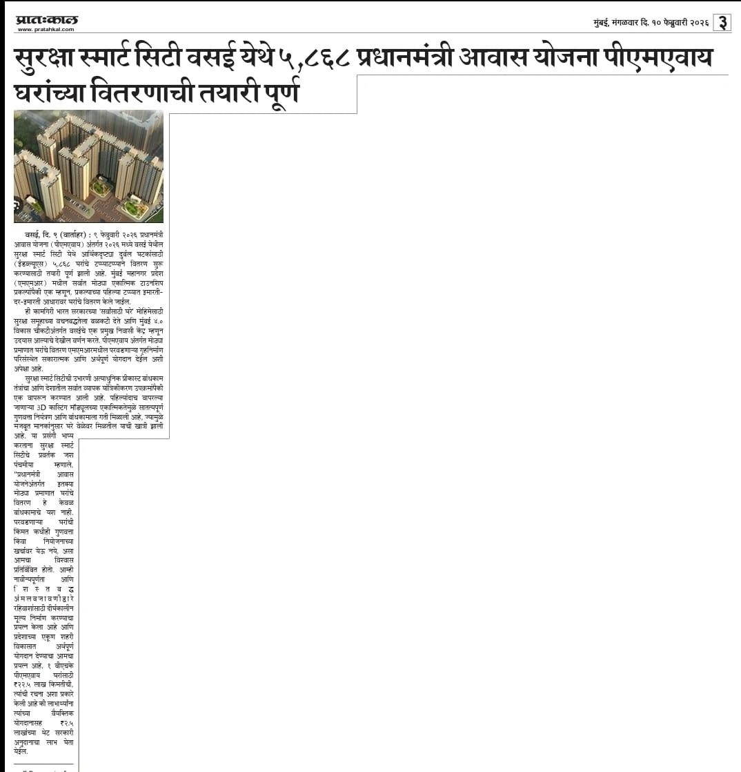 Under the Pradhan Mantri Awas Yojana (PMAY) during the calendar year 2026, Suraksha Smart City, Vasai is ready to begin the phased delivery of 5,868 Economically Weaker Section (EWS) homes.